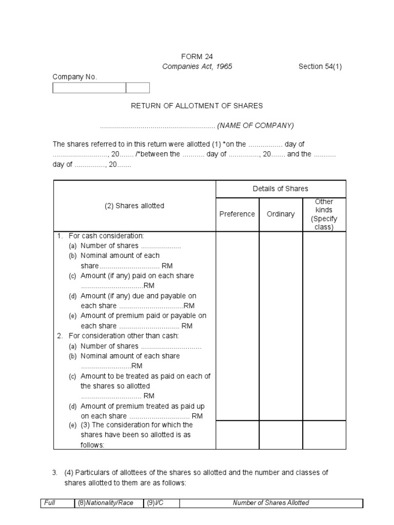 Form 24 Return Of Allotment Of Shares Company Registration In Malaysia